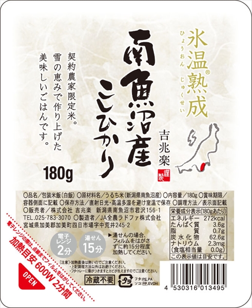 ガス窯で炊き上げた南魚沼産こしひかりを無添加で包装。パック米飯とは思えない柔らかな食感と美味しい食味を実現しました。