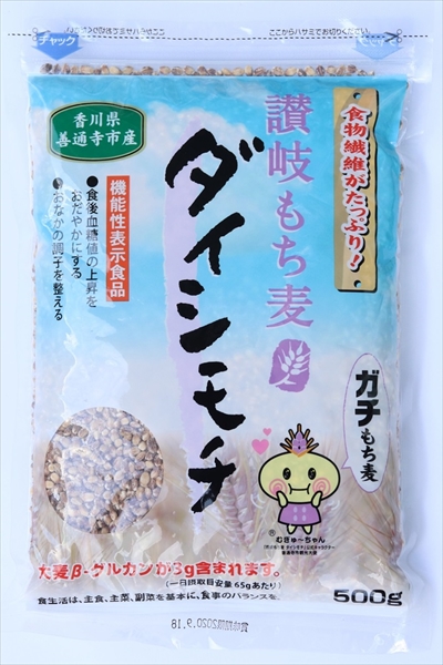 機能性表示食品の承認を受けた商品です。香川県善通寺市産のもち麦で、紫色の表皮が特徴です。