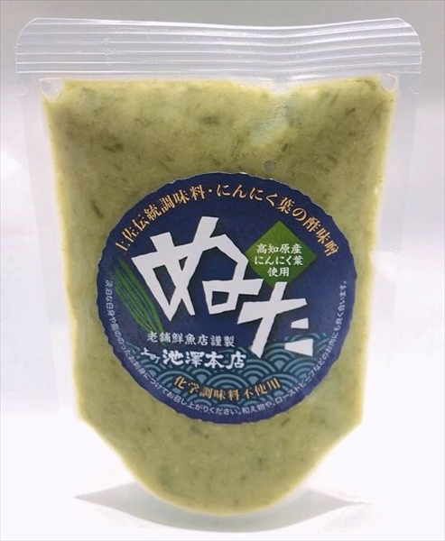 高知の伝統的な調味料土佐ぬた。酢味噌に葉ニンニクが入りさっぱりしつつパンチのきいた調味料で、ヒット商品です。