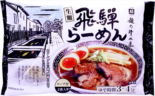 輸出向けに開発した常温保存可能な賞味期限180日の生麺を使用。スープは魚介の効いた醤油味です。
