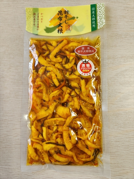 漬物グランプリ2024法人部門金賞受賞。国産の割干大根をごま、昆布、鰹節、醤油で漬け込みました。パリパリ食感が人気です。