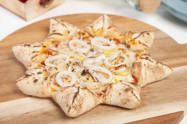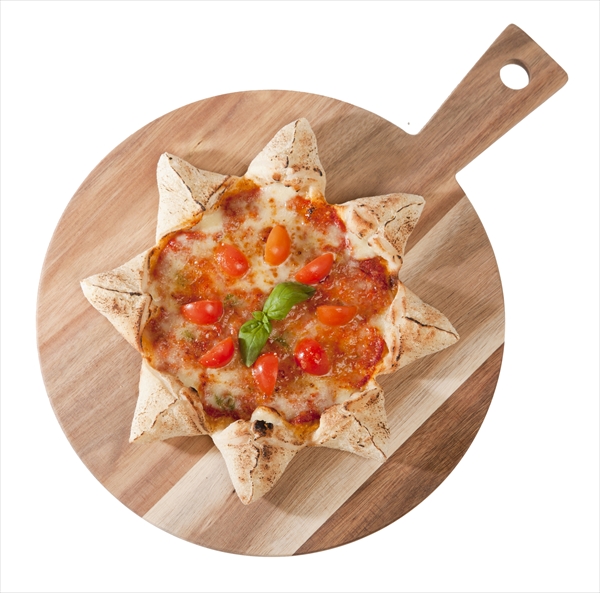 太陽をイメージしたピザ、耳の部分にチーズの入ったこだわりのピザ。フレーバーは8種類。