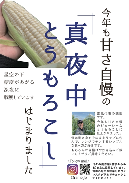 兵庫県豊岡市にて農産物の生産、集出荷選果業務を行なっております。 主力の商品は白ねぎ、とうもろこしとなります。 その他地域の生産者から様々な野菜、果物等を集荷し出荷も行えます。
